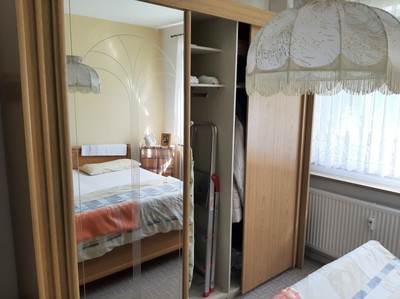 Der schiebeschrank hat auch fächer zum ablegen oder stangen zum aufhängen von kleidungsstücken.